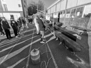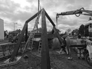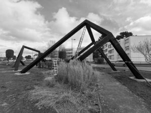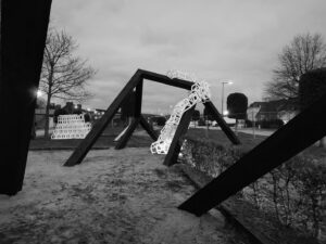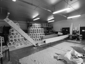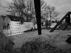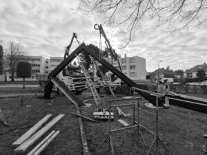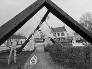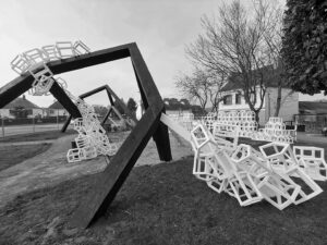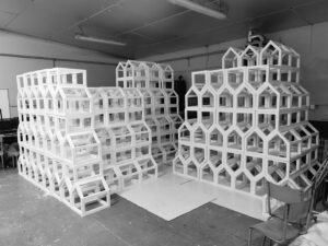 Invité à déambuler dans l’œuvre, le public se confronte aux grandes arêtes obliques d’une maison séparée en deux par son toit qui semble s’effondrer ou s’élever du sol. Cette maison-mère calcinée se voit prise d’assaut par des accumulations de maisonnettes qui la colonisent. Ces agglutinements tels des essaims peuvent être lus dans un mouvement de maintien, de portée ou de saisie, tirant l’élément tuteur à eux… questionnant l’ambivalence d’un rapport entre parasite et symbiose, d’un cycle entre ruine et reconstruction.