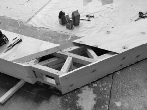Bois (douglas, épicea), peinture épicea, bois brûlé, vis, colle,